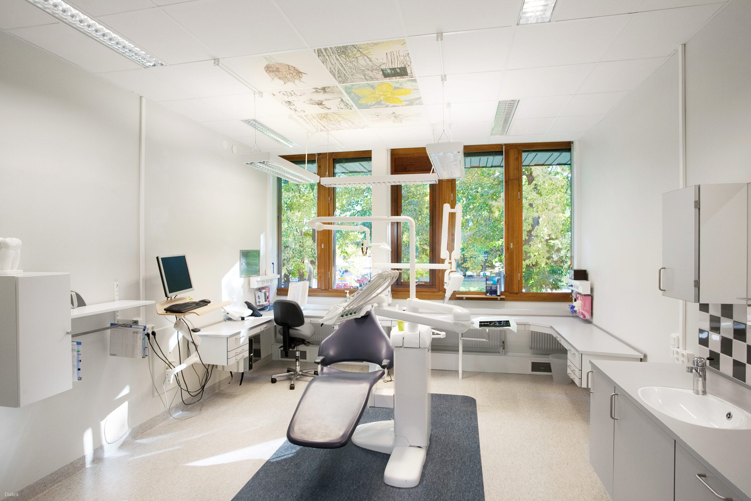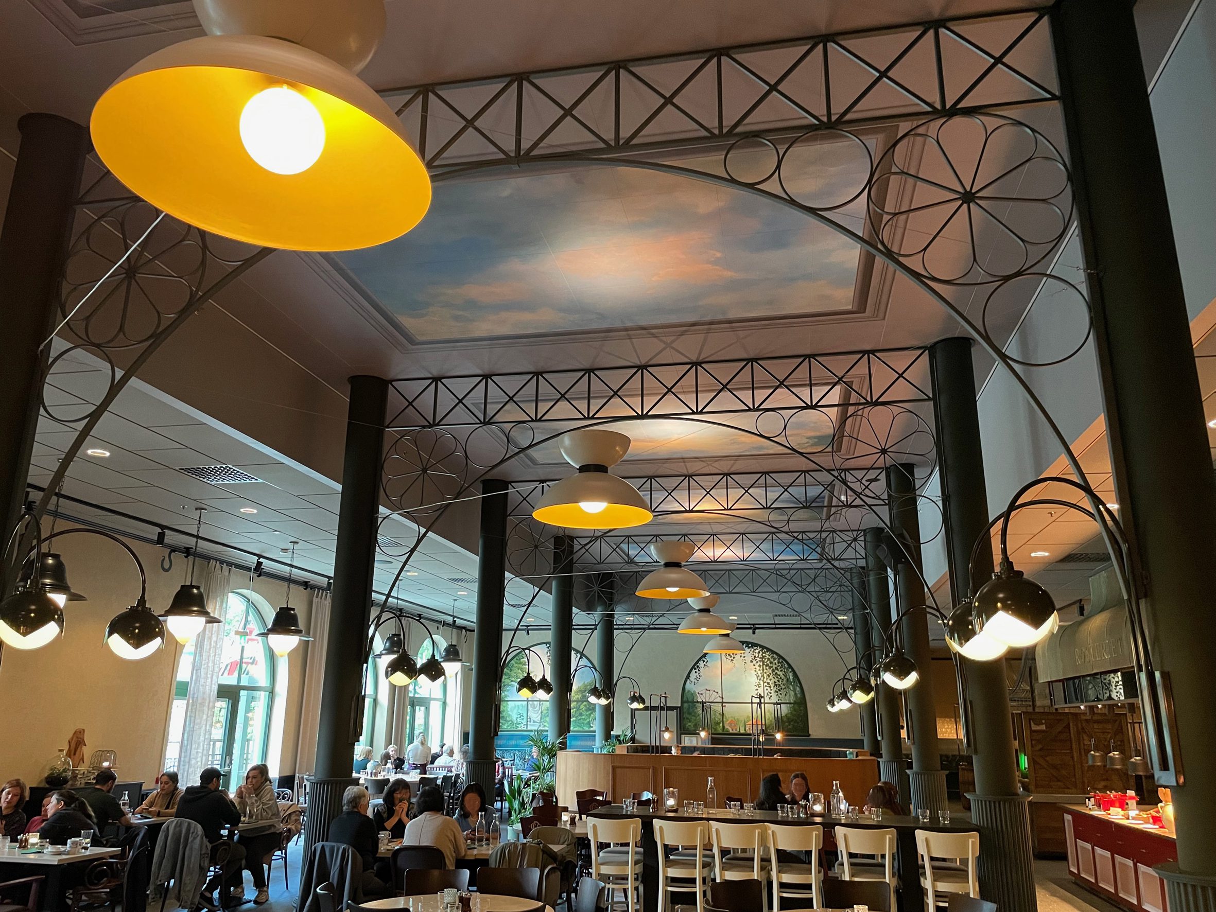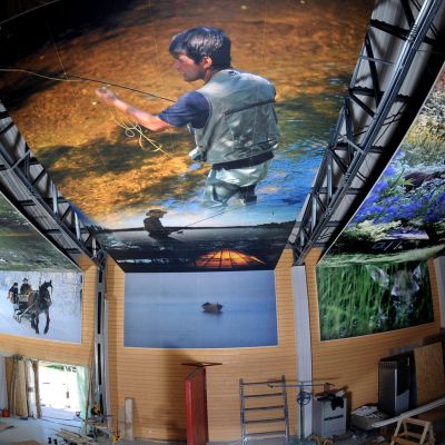 Akustiktryck tryckte himmel och stuckatur på ljudabsorbenter. Akustiktryckta takplattor förstärkt av belysningen skapar en ”på riktigt känsla på låtsas!”