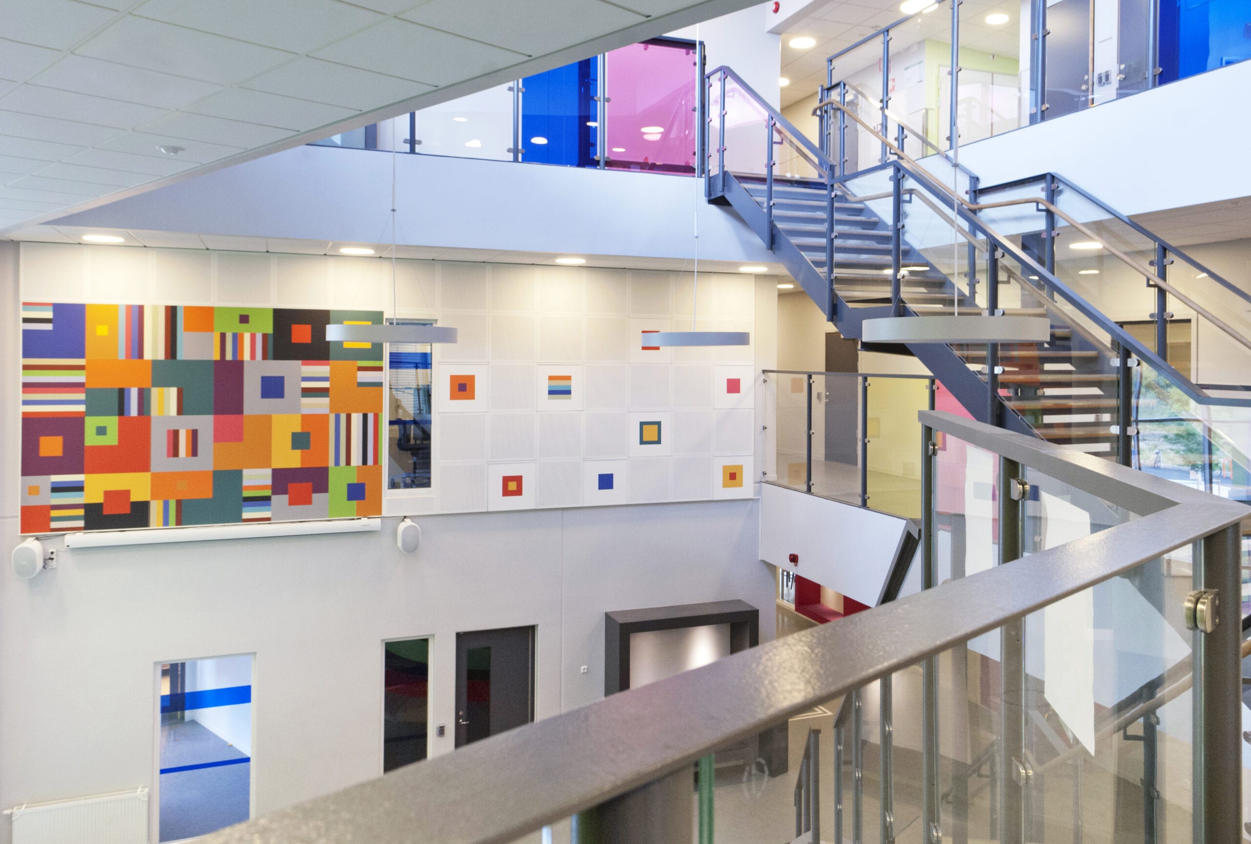Här har Roxtec verkligen använt möjligheterna som akustiktryck ger. Att få en bra ljudmiljö som betyder mycket för välmåendet. Akustiktavlorna lyfter företagets profil i ett fantastiskt färgspel som matchar och lyfter rummen estetiskt.