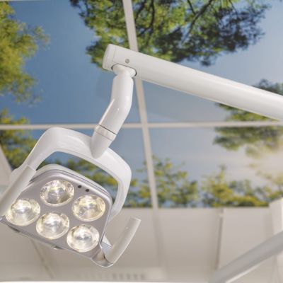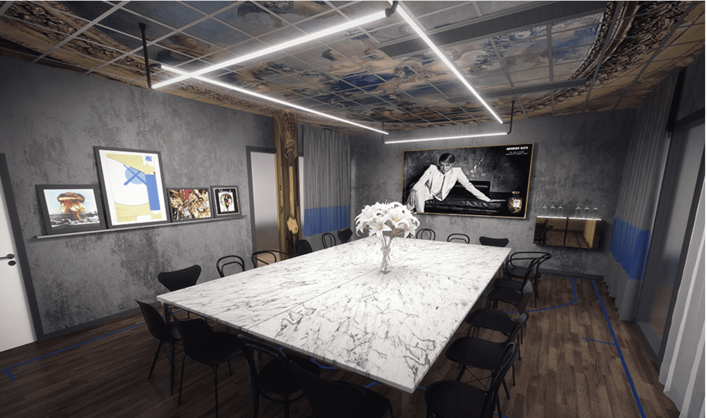 Akustiktryck tryckte himmel och stuckatur på ljudabsorbenter. Akustiktryckta takplattor förstärkt av belysningen skapar en ”på riktigt känsla på låtsas!”