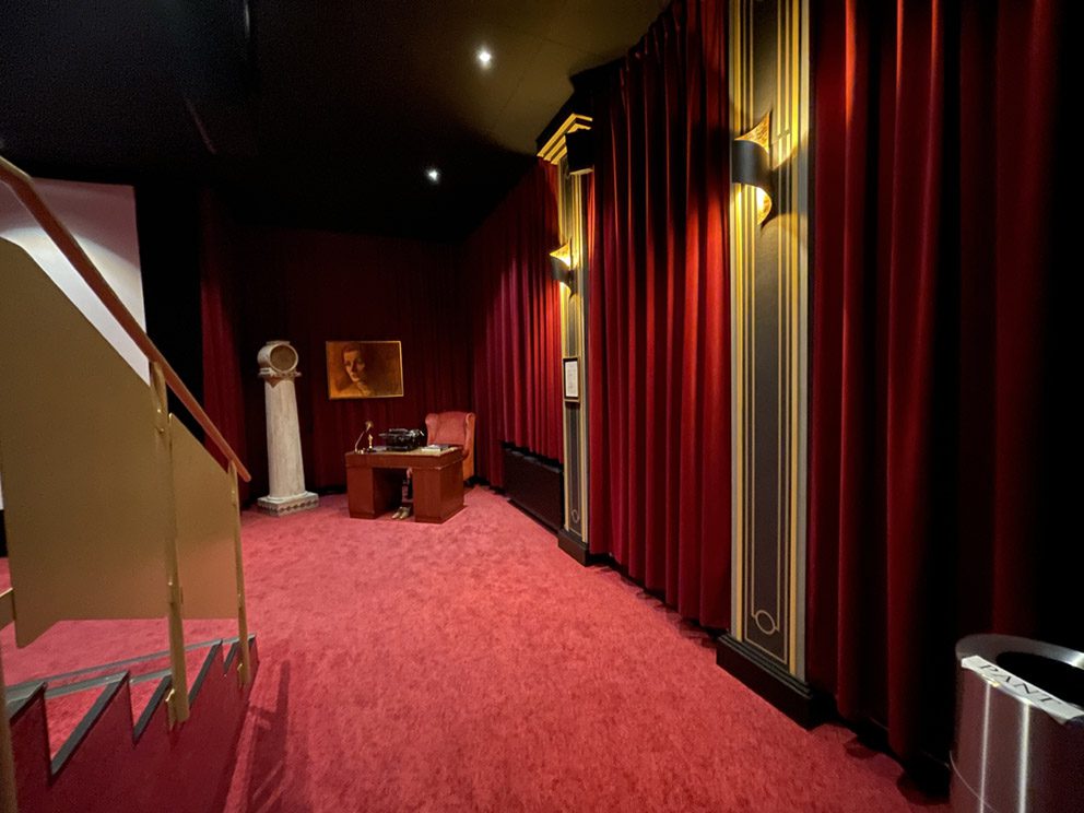 Svenska Bio har skapat en fantastisk upplevelse med inspiration av art déco. Tyg och pilastrar med akustiktryckta absorbenter.